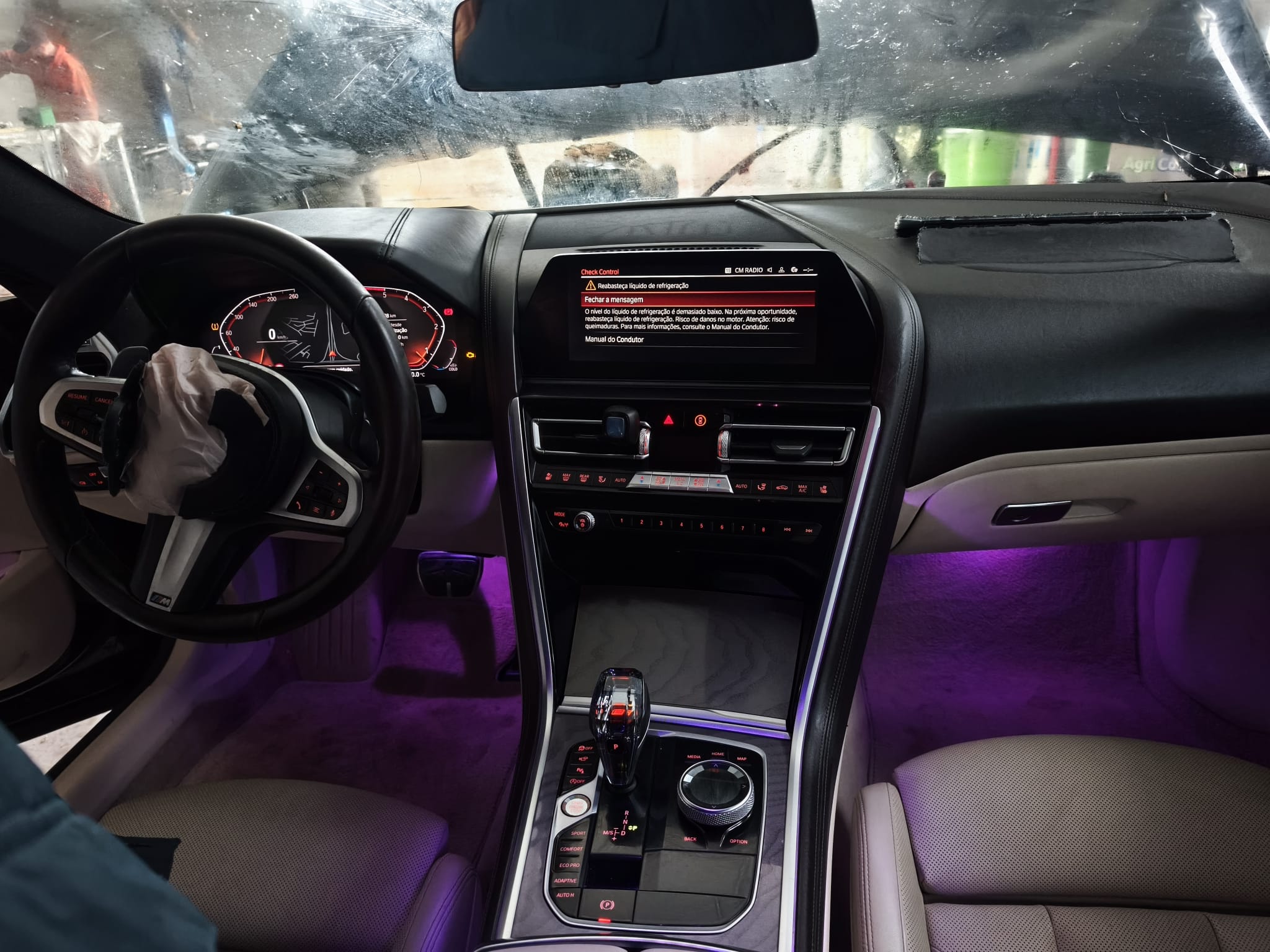 Interior em muito bom estado geral, com bancos em pele clara, iluminação ambiente e sistema multimédia funcional.
