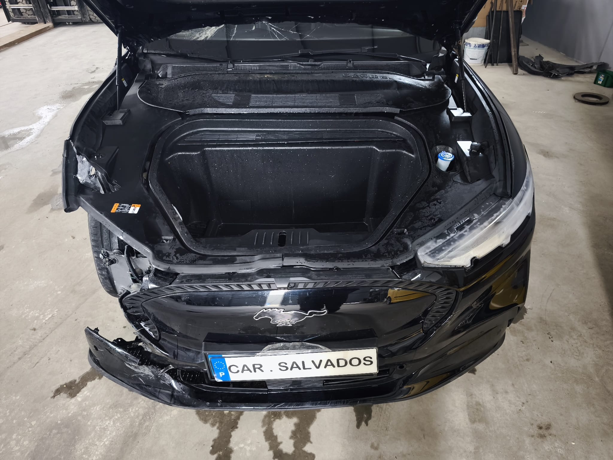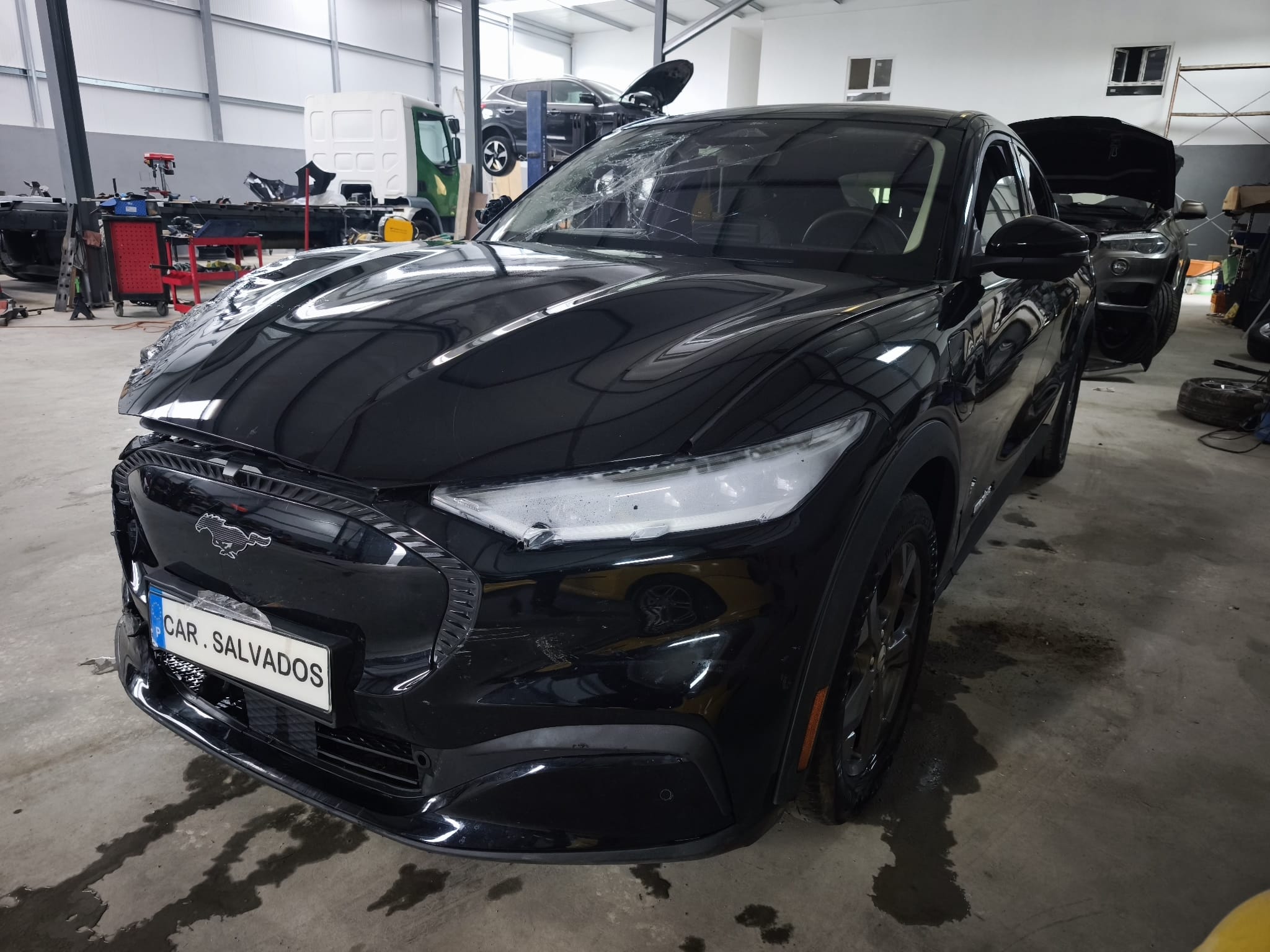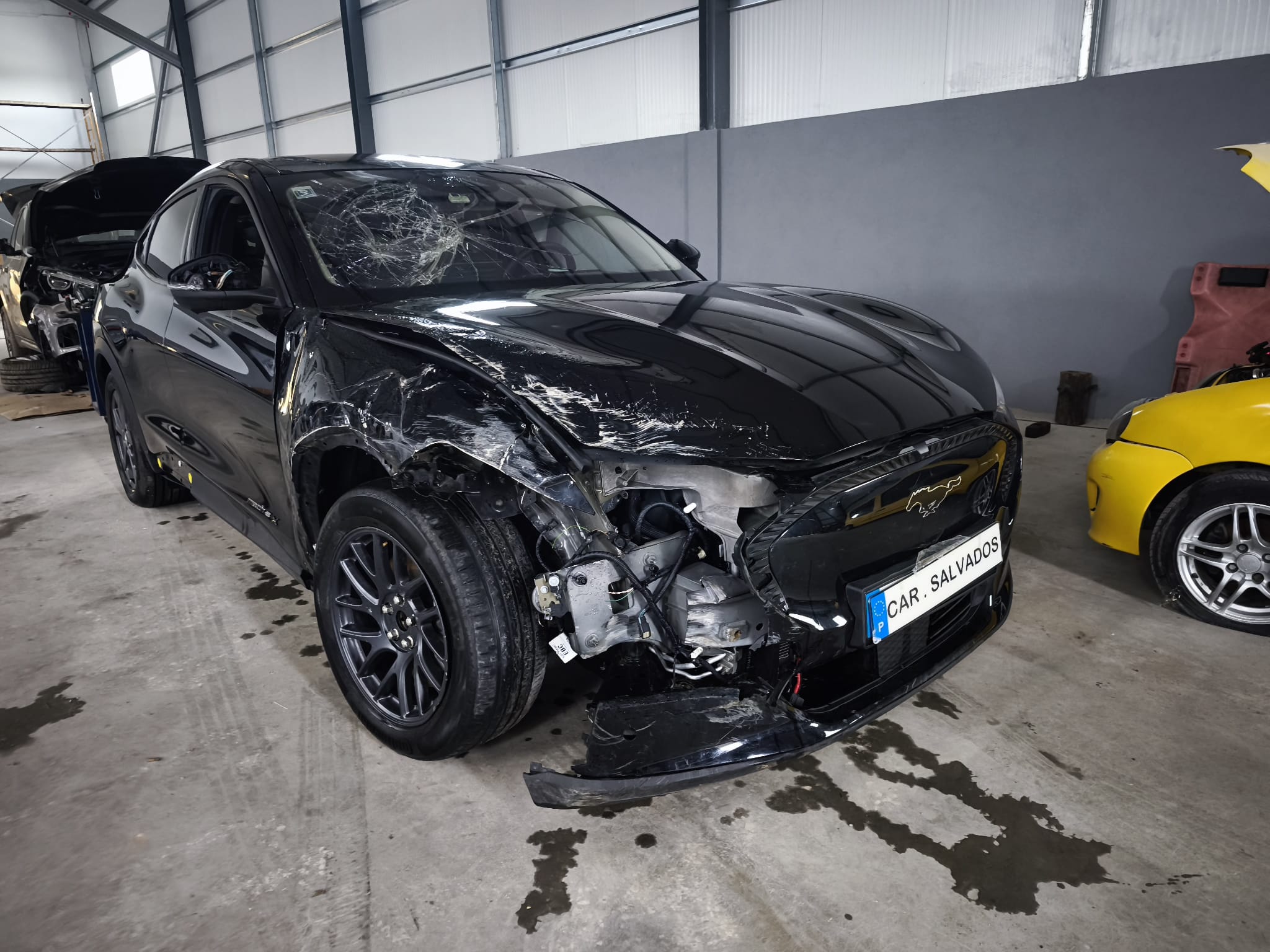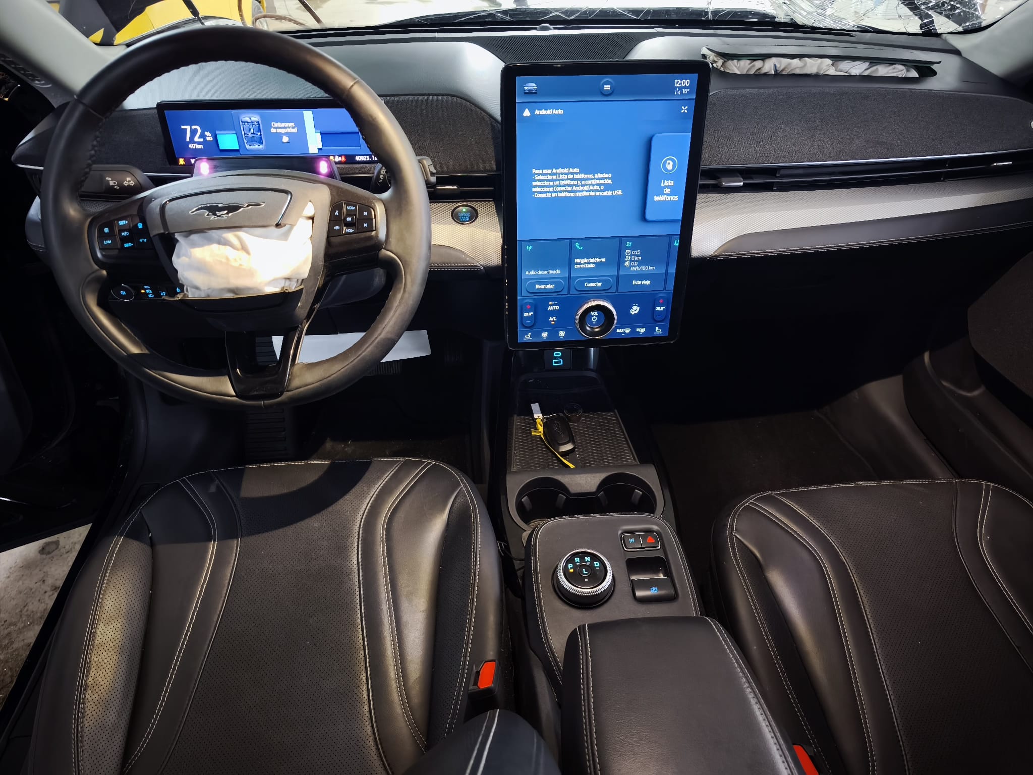 Ford Mustang Mach-E 100% elétrico, com design moderno e desportivo, equipado com um interior tecnológico e minimalista, onde se destaca o grande ecrã central vertical. O habitáculo apresenta bom estado geral, apesar do airbag do condutor e tablie terem sido acionados.