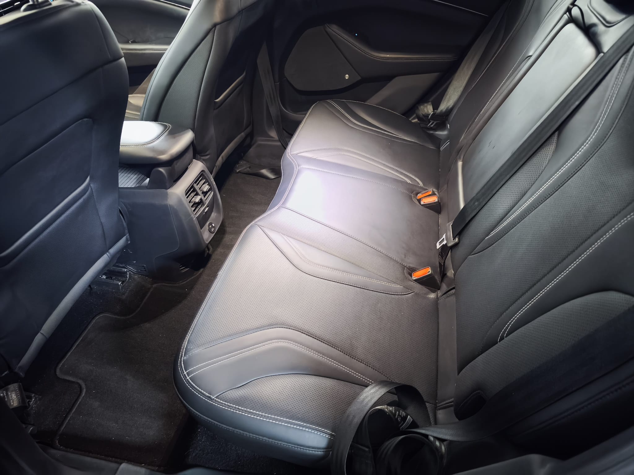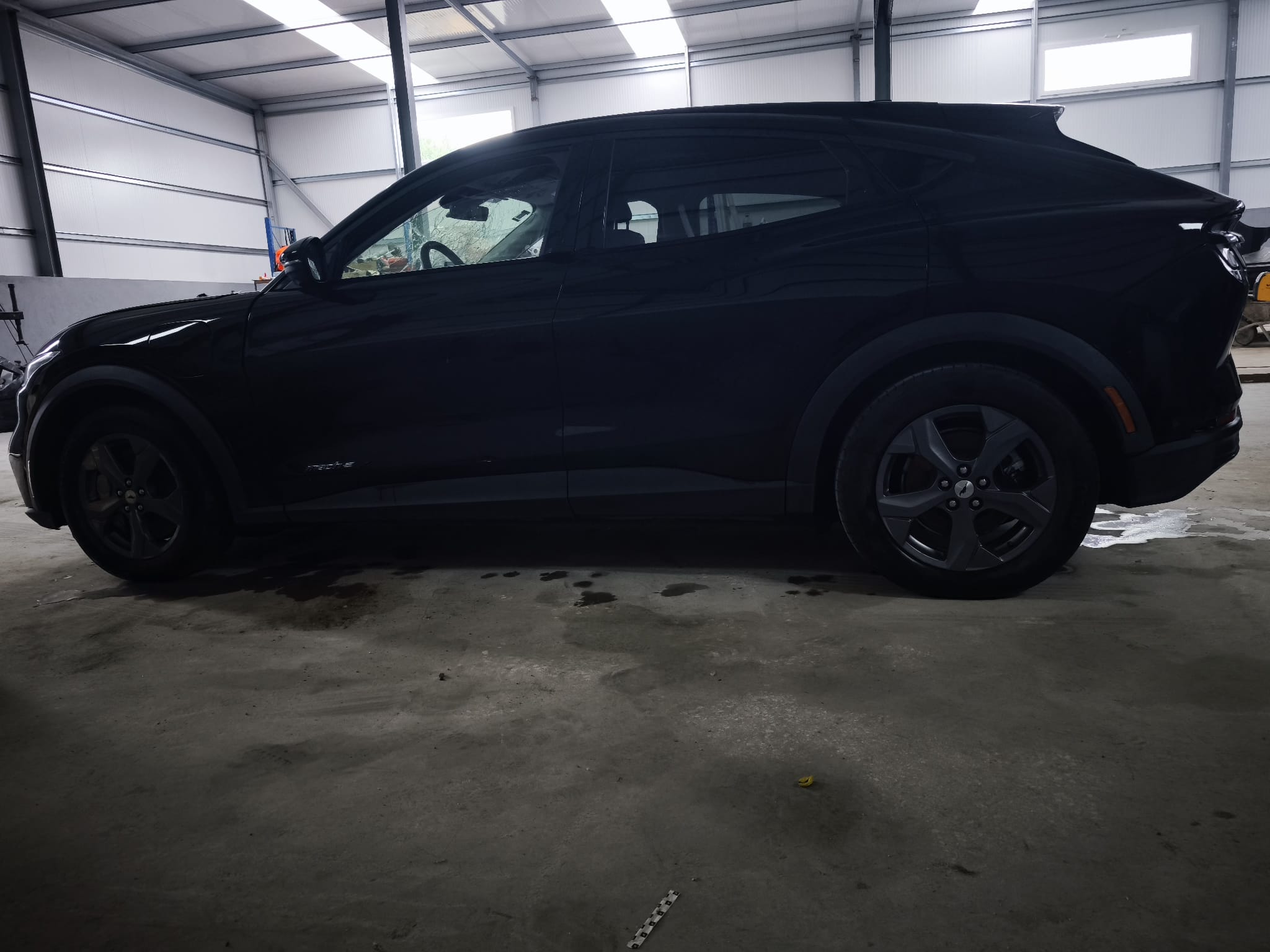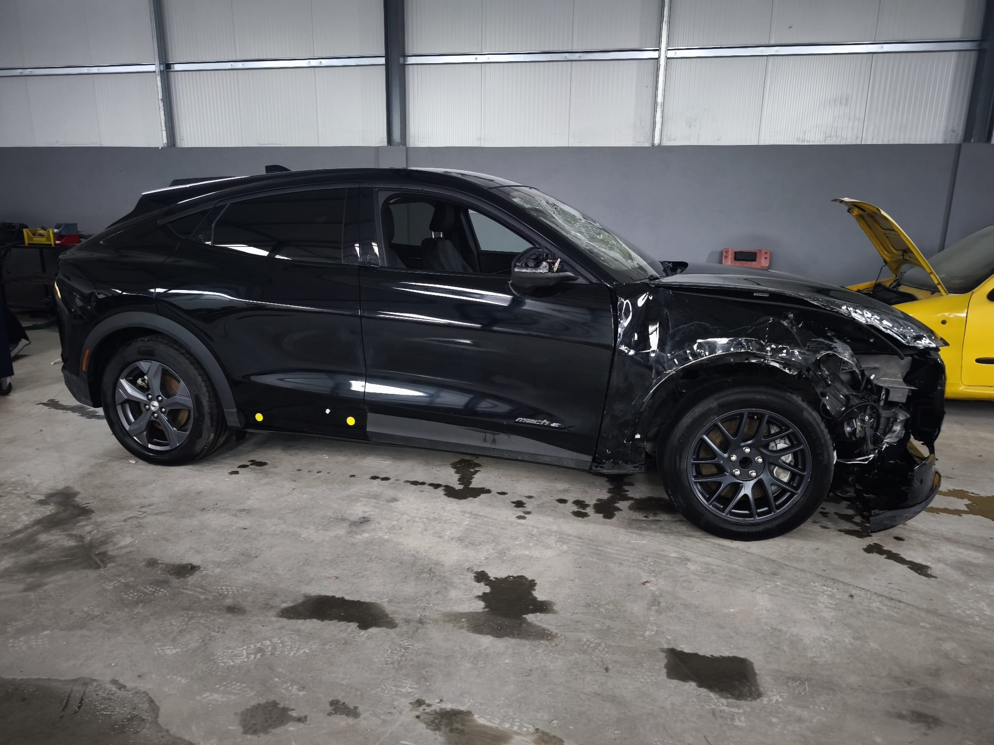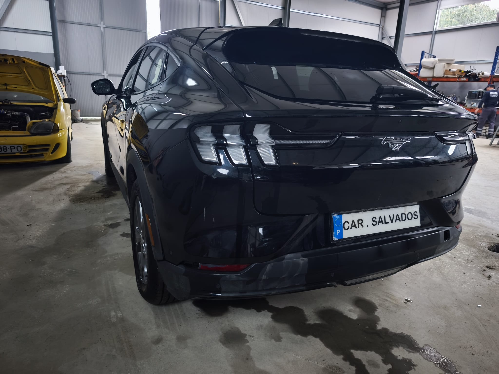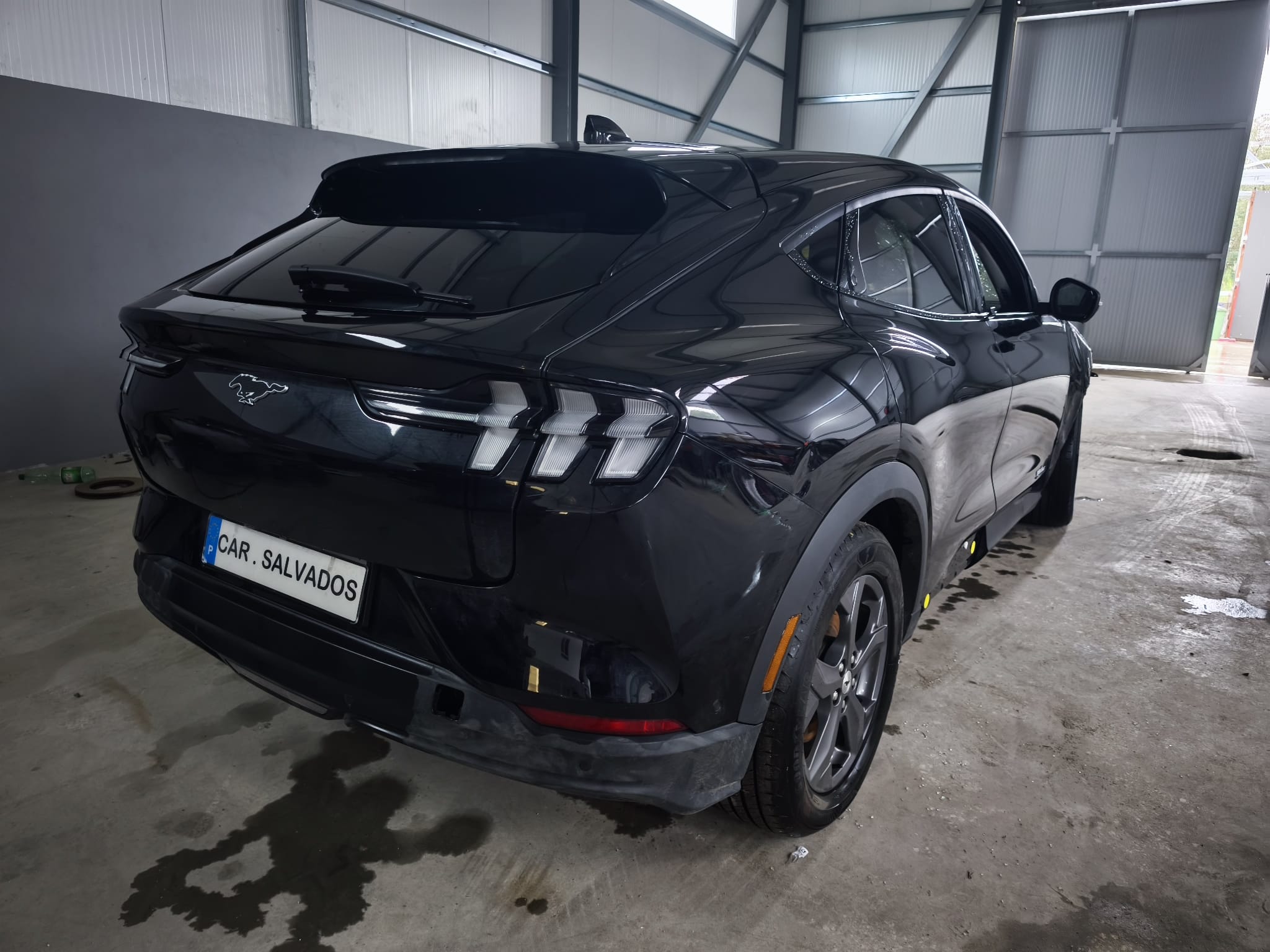 Ford Mustang Mach-E 100% elétrico, com design moderno e desportivo, equipado com um interior tecnológico e minimalista, onde se destaca o grande ecrã central vertical. O habitáculo apresenta bom estado geral, apesar do airbag do condutor e tablie terem sido acionados.