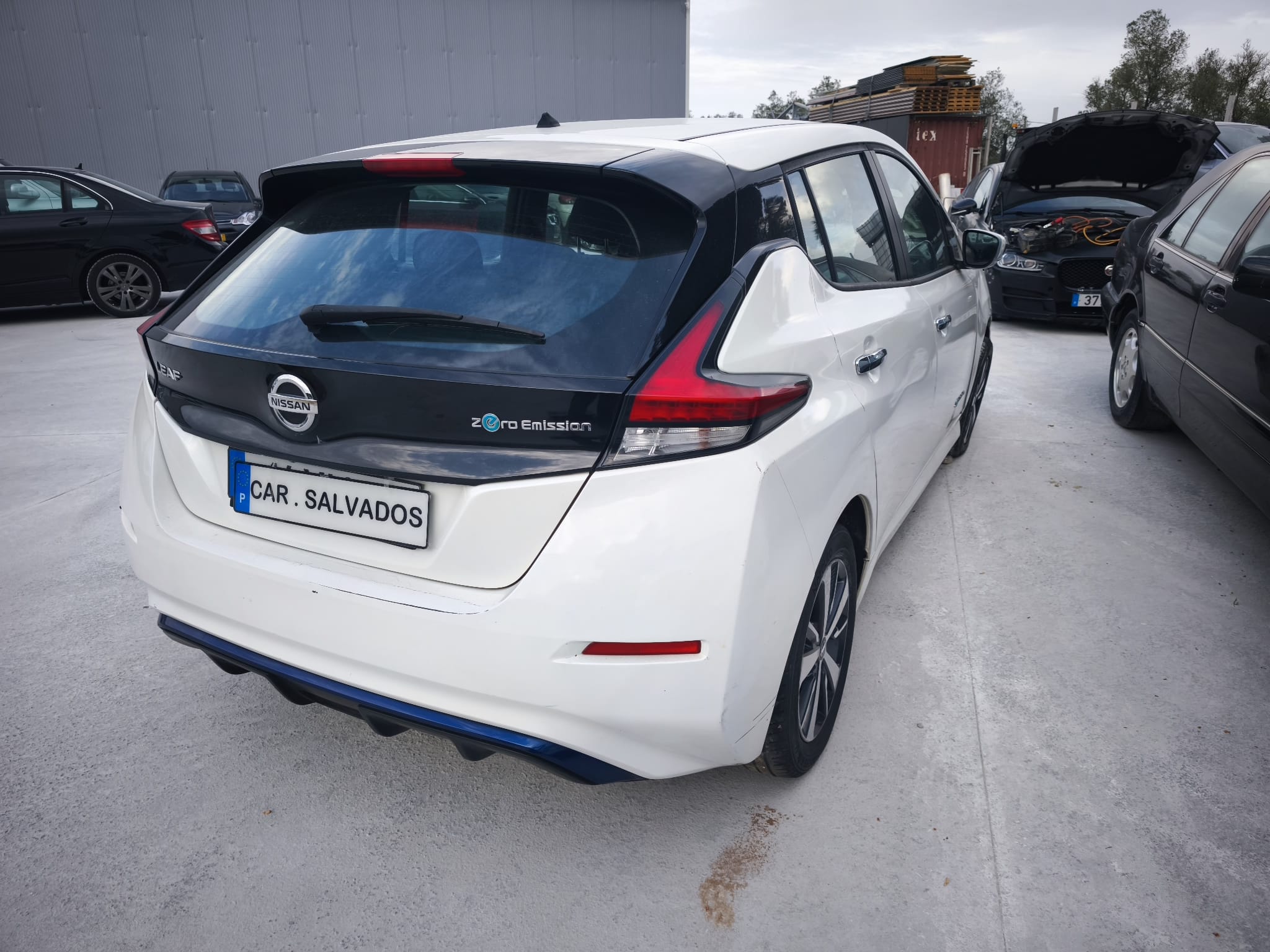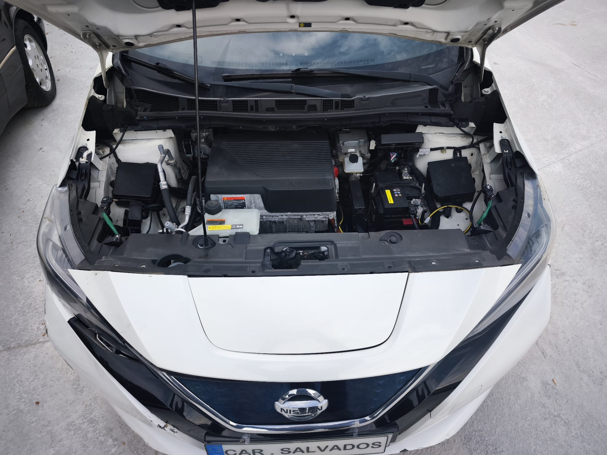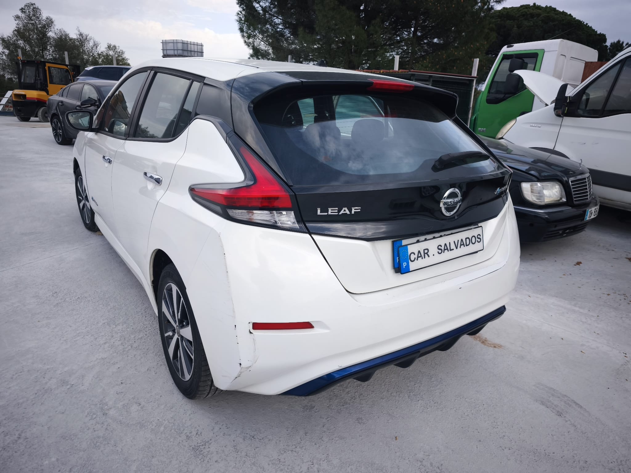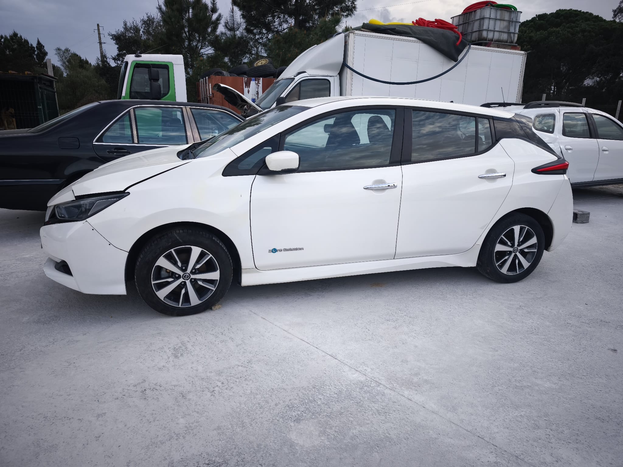 Nissan Leaf 100% elétrico, com sinais de uso e alguns danos na zona frontal direita. O veículo apresenta bom aspeto geral, com interior completo e funcional. Apesar dos danos visíveis, o carro trabalha e anda, sendo uma solução interessante para quem procura um elétrico económico para reparação ou utilização diária a baixo custo.